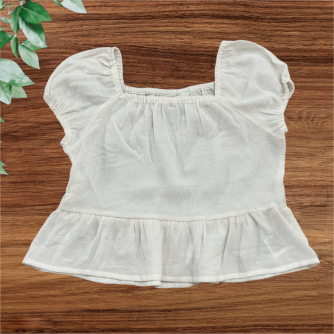 Törtfehér blúz Bőszabású, szögletes nyakkivágású, alja fodros. Hibátlan állapotú.