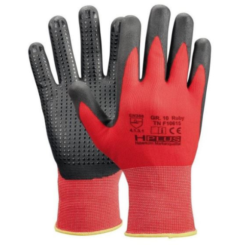 Mechanikai kesztyű, tenyérmártott, pontozott, H-PLUS Ruby Finomkötésű piros PES kesztyű fekete nitrilhab bevonattal. Univerzális kesztyű kötött mandzsettával, kiemelkedő tapintási érzékenységgel és megfelelő mozgékonysággal, a nitrilpöttyöknek köszönh