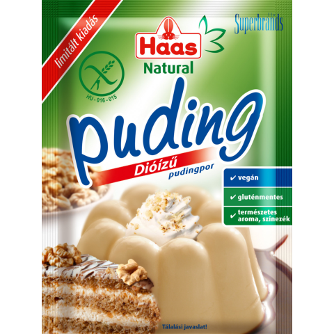 Haas natural pudingpor dió ízű 40 g Dióízű főzéssel készítendő pudingpor Összetevők: kukorica keményítő, természetes aroma, színezék (karamellizált cukor)