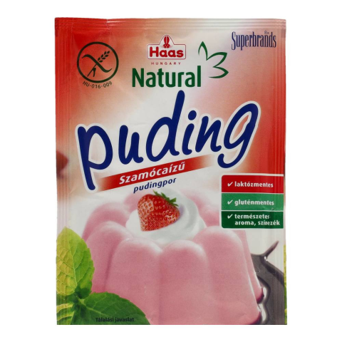 Haas pudingpor szamóca 40 g Megújult receptúra szerint, gluténmentes, kalciummal kiegészítve, természetes kármin extrakt színezék és természetes szamóca aroma felhasználásával