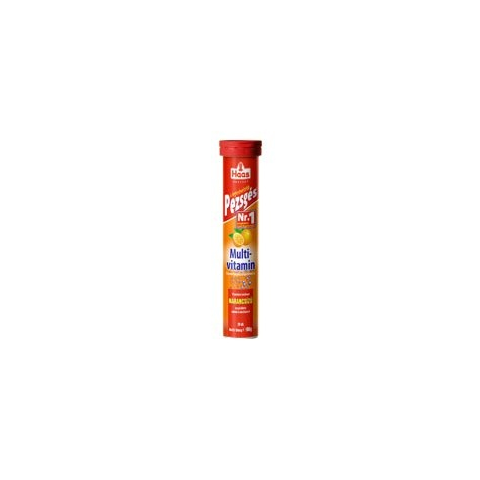 Vitaminokat tartalmazó narancsízű pezsgőtabletta cukorral és édesítőszerekkel Étrend-kiegészítő készítményÖsszetevőkÉtkezési sav (citromsav), Cukor, Savanyúságot szabályozó anyag (nátrium-karbonátok), Aromák (narancs, mandarin), L-aszkorbinsav, Édesítősze