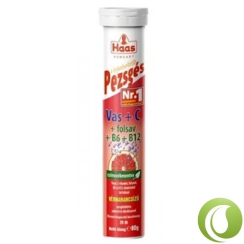 Haas pezsgőtabletta vas+c 20 db HAAS PEZSGŐTABLETTA VAS+C. Fontos szerepe van az oxigén szállításában, raktározásában, a sejtek növekedésében és szaporodásában.