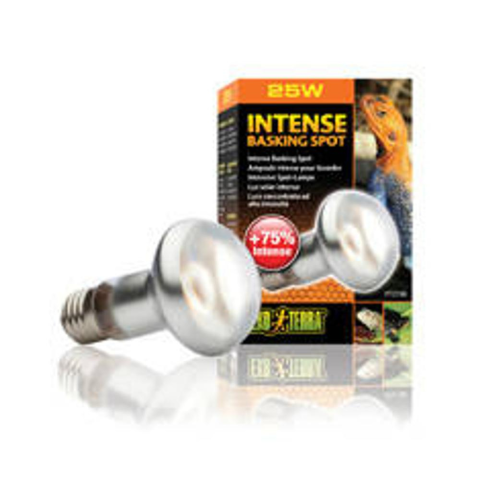 Exo Terra Intense Basking Spot 25 W- 35% megnövelt fény és hő a megvilágított területen- Sütkérező helyet hoz létre a hőszabályozáshoz- Növeli a környező levegő hőmérsékletét- UVA sugarakkal stimulálja a szaporodási viselkedést- Egy Night Heat lámpával vagy Infrared Basking Spot lámpával 24 órás ciklusban kombinálhatóEgy lámpa, melyet kifejezetten sütkérező helyek kialakítására terveztek. A szűk fénysugár precízen egy területre irányítható, ahol ez