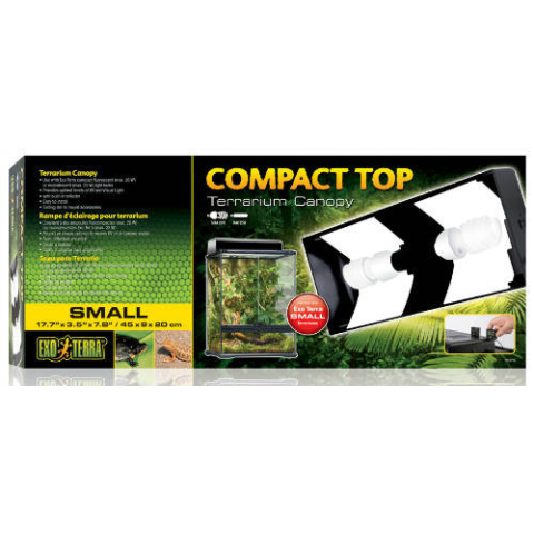 - Elhelyezhető benne egy vagy több kompakt fénycső vagy izzószálas égő (maximum 26 W)- Beépített reflektor- Könnyű felszerelés- Csúsztatható perem további kellékekhezAz Exo Terra Compact Top Canopy egy kompakt lámpatest és védőtető, mely az Exo Terra üvegterráriumokkal együtt használható. Ez a könnyen felszerelhető tető kompakt fénycsöveket vagy alacsony fogyasztású izzószálas égőket használ. Két különböző Exo Terra Repti Glo kompakt fénycsővel (PT22