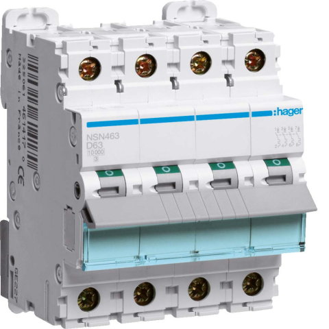 HAGER nagykatalógusHAGER NSN463 általános leírása:A kismegszakítók más néven automaták az elektromos hálózatok egyik legfontosabb védelmi elemei. Feladatuk, hogy túlterhelés vagy rövidzárlat esetén automatikusan megszakítsák az áramkört, így megvédve az e
