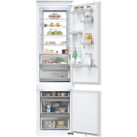 Beépíthető hűtő - kombinált (fagyasztós), energiaosztály D, hűtőtér tárolókapacitása 214 l, fagyasztótér tárolókapacitása 86 l, jobb oldali zsanéros, 4 polc, 3 fagyasztórekesz, 2 hűtőkör, kijelző, LED világítás, antibakteriális tömítés, nyaralási mód, nyitott hűtőajtó jelzés és smart funkciók, méretek 193,5 × 54 × 55 cm (Ma×Sz×Mé), az első díszítőpanel az ajtón nem a kiszerelés része A kombinált HAIER beépíthető hűtő tartalmaz a hűtőr