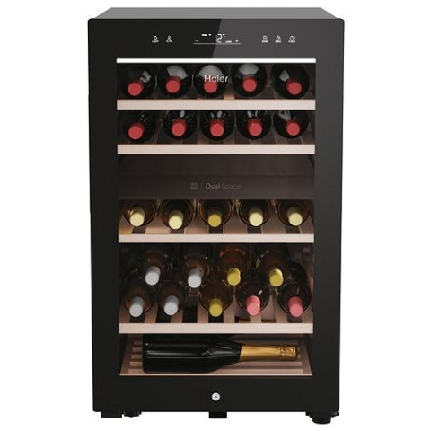 Borhűtő - G energiaosztályú, 42 palack számára, belső térfogata 106 l, 2 hűtőzónával, 4 polcos, automatikus leolvasztás, kijelző, digitális és távirányítású vezérlés, 5-20 °C között szabályozható hőmérséklet, 37 dB zajszinttel, mérete 82 × 49,7 × 58,5 cm (Ma×Sz×Mé), tömege 41 kg, fekete színű A szabadonálló HAIER borhűtőben a lehető legjobb minőségben tárolhatod el a kedvenc borodat. A borhűtő belső klímája stabil környezetet biztosít a boro