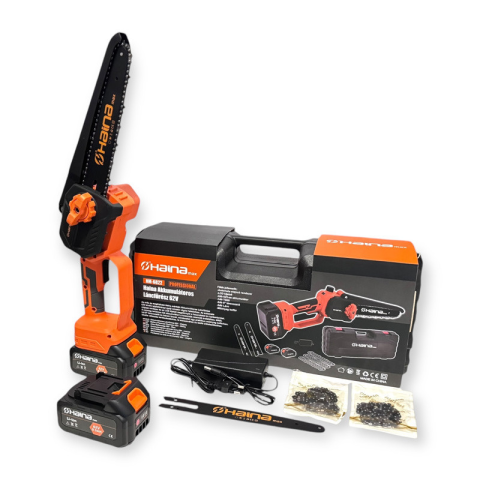 Haina Automata Olajozású Mini Láncfűrész 8" 2db Akkumulátorral És 2db Lánccal 62V HM-6822Tulajdonságok:Vágási felület: Ez a modell 8" -os vágási hosszal rendelkezik, amely tökéletes otthoni munkavégzéshez. Védőborítással rendelkezik a szálló forgács ellen.Kis súlyához nagy teljesítmény párosul, így komoly segítséget jelent a kerti és egyéb ház körüli munkákban.Fűrészelés az élekhez közel az új kialakítás révén, pl. az ágak tiszta levágásához a