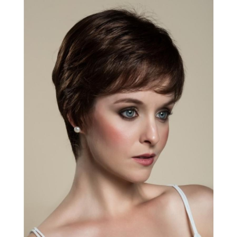 - Rövid fazonú paróka, fejtetőn megemelt frizurával- A tincsek hátul a tarkót szabadon hagyják, a füleket csak részben takarjál- I. osztályú szintetikus anyagból készül- Felnőtt fejformára készült, állítható- Sötét csokoládé színű