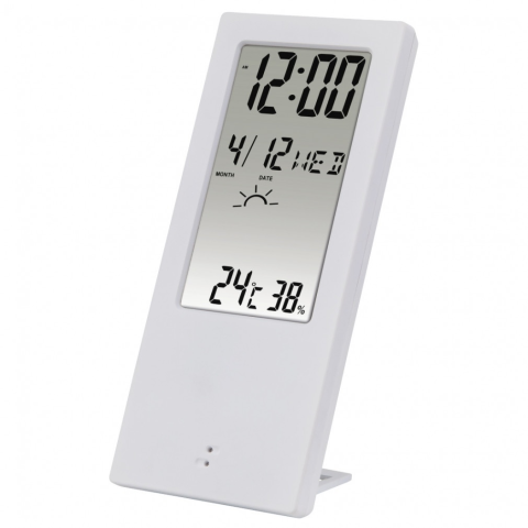 Digitális asztali óra, hőmérséklet, páratartalom mérővel Celsius fok és Fahrenheit között kapcsolható A min./max . értékek tárolása Mérési tartomány: -40 ° C és + 50 ° C között Időjárás-jelző: napos, felhős, esős (a környezeti páratartalom változása alapj