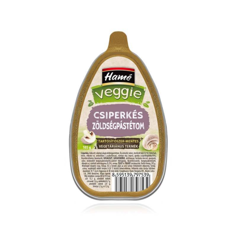Hamé veggie csiperkés zöldségpástétom 105 g Közvetlen fogyasztható zöldség alapú vegetáriánus pástétom, mely a hőkezelésnek köszönhetően nagyon hosszú szavatossági idővel bír. Tartósítószer mentes. Allergének: szója, tej, tojás Összetevők: víz, steri