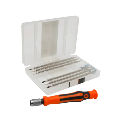 6db 120mm-es állítható bitszár 1 db gumírozott auto-lock markolat zárható műanyag tárolódobozzal Phillips (PH): PH0, PH1, PH2 Egyenes (-): 2 mm Torx (T): T5, T6, T7, T8, T9 Hex (H): 1.5, 2.0 Háromszög-alakú (TA): TA2 / 3mm Feszítőfejes (M):