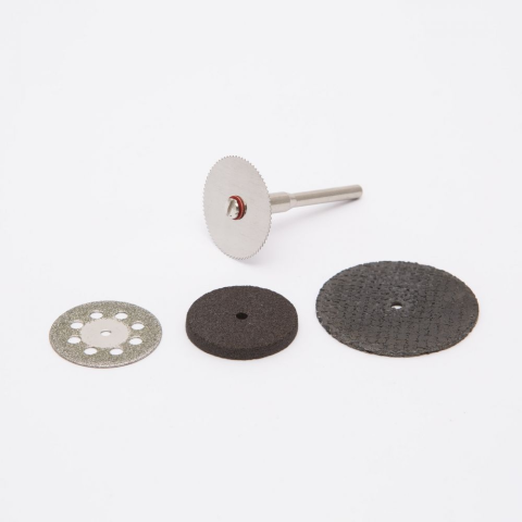 A szett tartalma: 1 db műgyantás korong 1 db vágókorong 1 db fémkorong 1 db gyémántkorong 1 db 3,1mm átmérőjű rögzítő tengely Max fordulat: 28000/perc