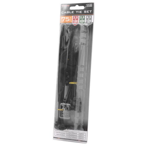 Vezetékkötegelő szett 75 db / csomag Anyaga: Nylon 66 (94V.2) Típus: önzáró Méret: 2.5 x 100 mm - 25 db Méret: 4,5 x 120 mm - 25 db Méret: 2,5 x 200 mm - 25 db Szín: fekete