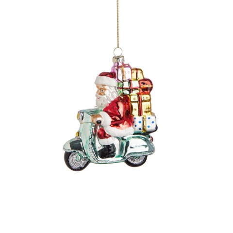 1 kép HANG ON üveg karácsonyfadísz, Mikulás robogón ajándékokkal