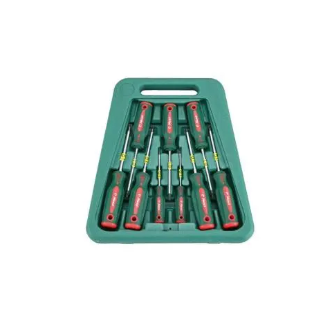 HANS Furatos TORX Csavarhúzó készlet CrV • Ergonomikus kialakítású, kémiailag semleges, kétkomponensű markolat • Csúszásbiztos kivitel • Mágneses hegy • Kemény műanyag mag a penge biztos rögzítéséért • Foszfátozott hegy az oxidáció ellen és a biztos illeszkedés érdekében • Anyagösszetétel Chrome-Vanadium • Hordozható, falra akasztható szerszámtartóban • furatos TORX csavarhúzók: TH8 / TH9 / TH10 / TH15 / TH20 / TH25 / TH27 / TH30 / TH40