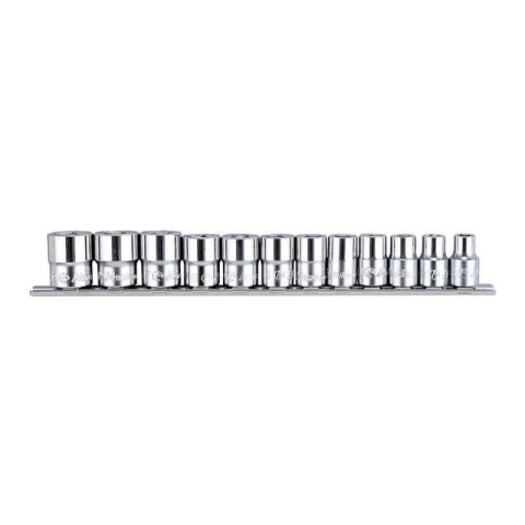 HANS 3612M 3/8-os dugókulcsfej készlet 12 részes, 8-19 mm, 6 lapú Tartalom: 3/8''-os hatlapfejű dugókulcsok: 8, 9, 10, 11, 12, 13, 14, 15, 16, 17, 18, 19 mm Tartósínen Anyagösszetétel Chrome-Vanadium DIN3124 – ISO2725