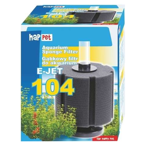 A Happet E-Jet akváriumi szivacsszűrő egy sűrű cellázású, súlyos talpra rögzített szivacsszűrő akváriumba. A szivacs anyaga a mechanikai szűrés mellett biológiai szűrést is biztosít. Ideális szűrés nevelő vagy karantén akváriumba, garnélás vagy nano akváriumba, de másodlagos szűrőként is alkalmazható. Légpumpára vagy vízpumpára köthető, vagy előszűrőként is használható.