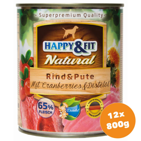 Happy&Fit Natural Dog Konzerv Marha&Pulyka Áfonyával&Sáfrányolajjal 12x800g kutyaeledel 1 kép