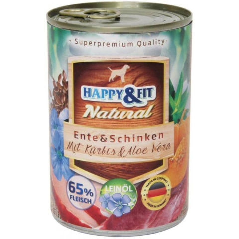 Happy&Fit Natural felnőtt, kacsa, sonka, sütőtök 6x400g kutyaeledel termékleírás