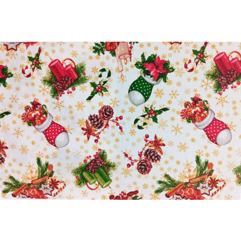 A Happy Home karácsonyi asztalterítő vegyes mintáival – hóemberek, mézeskalács figurák, fenyők, koszorúk és ajándékok – melegséget és vidámságot hoz az otthonodba. Két méretben elérhető: