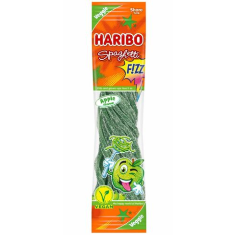 A Haribo Spaghetti Apple Sour hosszú, spanyolországi gumicukor savanyú cuktros Alma ízben.Kb 35db 20cm hosszú spagetit tartalmazz.