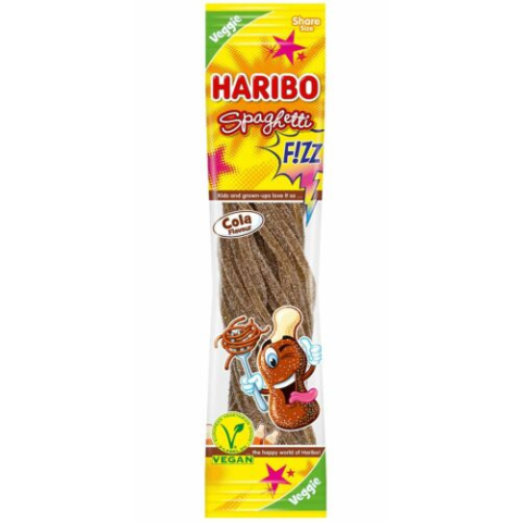 A Haribo Spaghetti Cola Sour hosszú, spanyolországi gumicukor savanyú cuktros Cola ízben.Kb 35db 20cm hosszú spagetit tartalmazz.