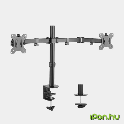 Asztal lapjára szerelhető karos dupla LCD-, LED monitor tartó 13-27"-os képernyőkhöz.  A kijelző 0-440 mm közti távolságban állítható az asztaltól, vízszintesen pedíg a középső tartó csőtől 0-460 mm...