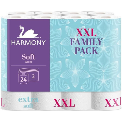 Toalettpapír 3-rétegű HARMONY SOFT XXL – 24 tekercsHáromrétegű toalettpapír nem parfümözött, feltekerve 17,5m – 24 tekercs.