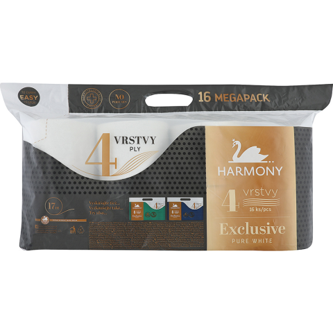 Toalettpapír 4-rétegű HARMONY EXCLUSIVE PURE WHITE - 8 tekercsNégyrétegű toalettpapír nem parfümözött, feltekerve 17 m – 8ks