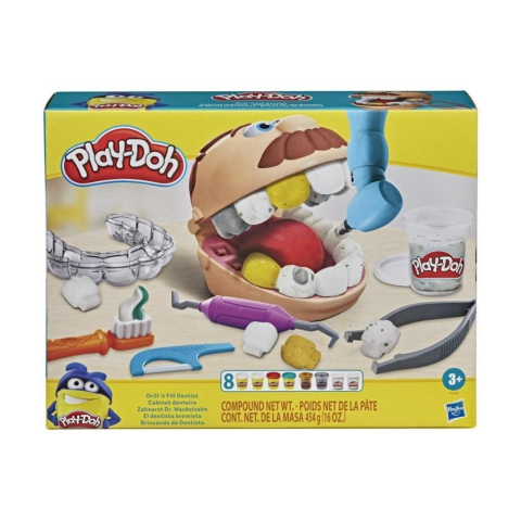 Dr. Drill és Fill visszatért, több lukas foggal, mint valaha!A fogorvosos játék még szuperebb lett a lukakat szimbolizáló gyurmadarabokkal, az arany és ezüst színű gyurmákkal a fogszabályzókhoz és tömésekhez, valamint az új, akkumulátor nélküli fogfúróval