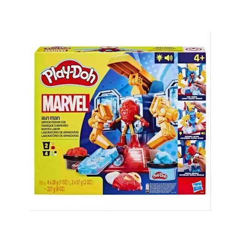 - Kreatív játék a Vasember páncél tervezéséhez - Sablonok és robotkarok a formázáshoz - 6 tégely Play-Doh gyurma (metálfényű színek) - Fény- és hangeffektek a valósághű élményért