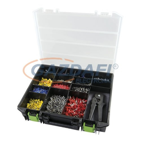 Tartalom: - 5.100 Szigetelt érvéghüvelyek, - 1 présfogó (Cikksz. 210804), préstartomány 0,5 - 10 mm² - műanyag szortimentes dobozban 420 x 350 x 60 mm Megnevezés Hossz mm Vkm mm2 100 Kettős (Twin) érvéghüv