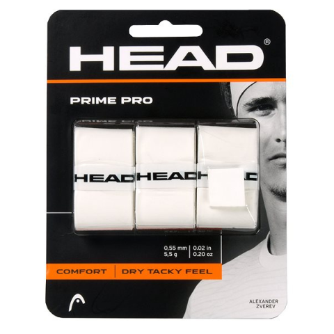 Grip ütőhöz - felső, 0,55 mm vastagság, anyaga poliuretán, 3 db a csomagban, fehér kivitel Head Prime Pro is a tennis grip that will give you a great feeling from the game and provide security with every stroke. It is made of special materials to ensure maximum sweat absorption and