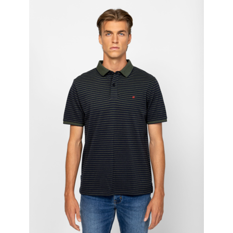 Férfi rövid ujjú galléros póló, klasszikus szabással, oldal hasítékkal, elegáns gombos, galléros nyakmegoldással, vékony csíkozással, elején 3D hatású márkajelzéssel. Ujja alja kényelmes, bordázott passzéban végződik. Anyaga: 100% pamut, piké. A modell 188 cm magas és L-es méretet visel. T20053W2501