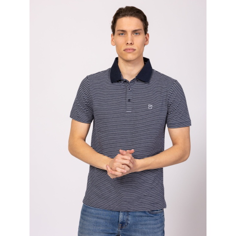 Heavy Tools Férfi Póló Dewitt T20030S2501. Színe: navy Férfi rövid ujjú galléros póló, vékony csíkos anyagból, klasszikus szabással, oldal hasítékkal, elegáns gombos, galléros nyakmegoldással, elején és oldalában kis szövött márkajelzéssel. Anyaga: 100% pamut, single jersey. A modell 188 cm magas és L-es méretet visel. T20030S2501