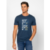 Férfi rövid ujjú póló, egyenes szabással, kerek nyakkal, elején nagy nyomott dekorációval és márkajelzéssel, oldalában szövött címkével. Anyaga: 100% pamut, single jersey. A modell 188 cm magas és L-es méretet visel. T16102W2501