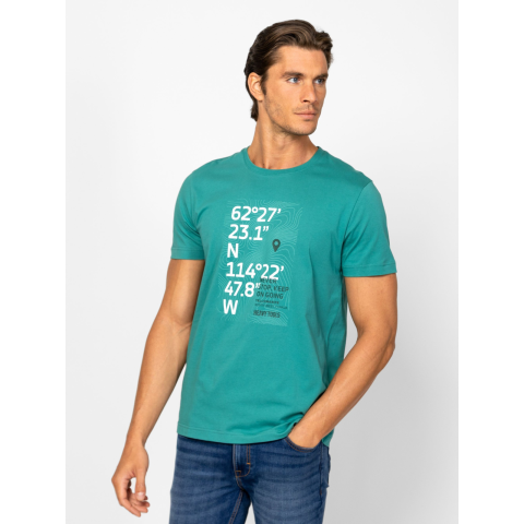 Férfi rövid ujjú póló, egyenes szabással, kerek nyakkal, elején nagy nyomott dekorációval és márkajelzéssel, oldalában szövött címkével. Anyaga: 100% pamut, single jersey. A modell 188 cm magas és L-es méretet visel. T16102W2502