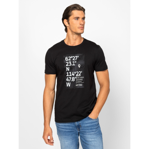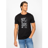 Férfi rövid ujjú póló, egyenes szabással, kerek nyakkal, elején nagy nyomott dekorációval és márkajelzéssel, oldalában szövött címkével. Anyaga: 100% pamut, single jersey. A modell 188 cm magas és L-es méretet visel. T16102W2504
