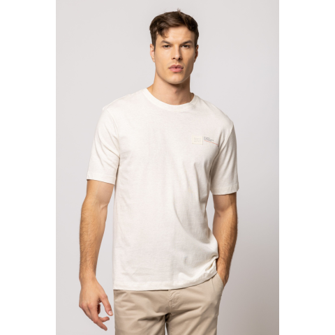 Heavy Tools Férfi Póló Melfort T16059S2501. Színe: bone Férfi rövid ujjú póló, egyenes szabással, kerek nyakkal, elején nyomott és szövött márkajelzéssel. Anyaga: 100% pamut, single jersey. A modell 188 cm magas és L-es méretet visel. T16059S2501