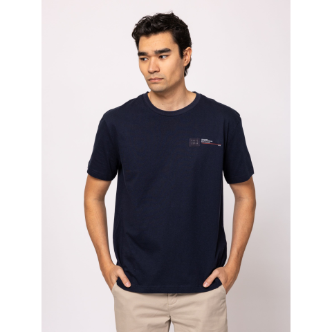 Heavy Tools Férfi Póló Melfort T16059S2503. Színe: navy Férfi rövid ujjú póló, egyenes szabással, kerek nyakkal, elején nyomott és szövött márkajelzéssel. Anyaga: 100% pamut, single jersey. A modell 188 cm magas és L-es méretet visel. T16059S2503
