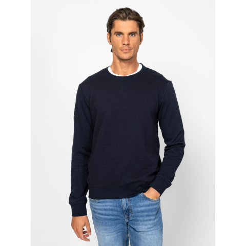 Férfi kerek nyakú pulóver, klasszikus megjelenéssel, többféle anyaggal, kis szövött márkajelzéssel az ujján. Anyaga: eleje: 50% poliészter, 48% pamut, 2% elasztán, jacquard anyag, ujjak, háta, váll rész, háromszög: 100% pamut, french terry. A modell 188 cm magas és L-es méretet visel. T01013W2501