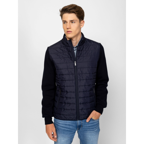Heavy Tools Férfi Pulóver Hamelo T52027W2501. Színe: navy Férfi cipzáros kardigán, kötött és steppelt részletekkel, kényelmes szabással, steppelt gallérral, elejével és háttal, cipzáros zsebekkel, kis fém márkajelzéssel az ujján. Anyaga: eleje, háta, gallér: 100% nylon, tömés: 100% poliészter, lightweight, ujjak: 100% pamut, kötött anyag. A modell 188 cm magas és L-es méretet visel. T52027W2501
