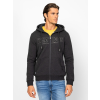 Férfi cipzáros, kapucnis pulóver, klasszikus szabással, kenguruzsebbel, bordás passzés kézelővel és aljjal, elején applikált, hímzett márkajelzéssel, zsebénél kis szövött márkajelzéssel. Anyaga: 57% pamut, 43% poliészter, belül bolyhozott fleece. A modell 188 cm magas és L-es méretet visel. T03046W2502