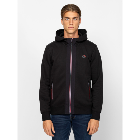 Férfi cipzáros, kapucnis pulóver, sportos megjelenéssel, többféle anyaggal, cipzáros zsebekkel, nyomott márkajelzéssel az elején, színes cipzárral. Viseld hozzá ZANDO melegítőnadrágunkat. Anyaga: 80% pamut, 20% poliészter, belül bolyhozott fleece, 100% poliamid, ripstop. A modell 188 cm magas és L-es méretet visel. T03037W2501