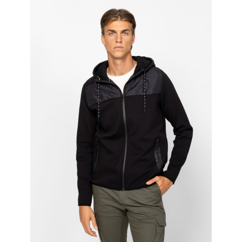 Férfi cipzáros, kapucnis pulóver fleece és steppelt részletekkel, egyenes, kényelmes szabással, cipzáros zsebekkel, ujján kis márkajelzéssel. Anyaga: eleje és háta: 76% pamut, 19% poliészter, 5% elasztán, kapucni, eleje és háta váll rész: 100% nylon lightweight. A modell 188 cm magas és L-es méretet visel. T03033W2502
