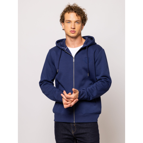 Heavy Tools Férfi Pulóver Solver T03017W2401. Színe: moonlight Férfi cipzáros, kapucnis pulóver, klasszikus szabással, izgalmas színekben, egyenes zsebekkel, bordás passzés kézelővel és aljjal, elején hímzett márkajelzéssel, jobb zsebén fém márkajelzéssel. Anyaga: 75% pamut, 25% poliészter, belül bolyhozott fleece. A modell 188 cm magas és L-es méretet visel. T03017W2401