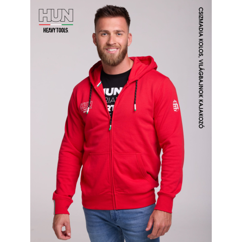 Heavy Tools Férfi Pulóver Super A3S24033RE. Színe: red Férfi szurkolói, cipzáras, kapucnis pulóver, egyenes szabással, bordás passzés aljjal és kézelővel, kenguruzsebbel, magas pamut tartalmú anyagból, nyomott, nemzeti színű felirattal és kis márkajelzéssel az elején, nagy nemzeti nyomással a hátán, nemzeti címerrel a bal ujján, nemzeti szalaggal a jobb kélzelőn. Anyaga: 80% pamut, 20% poliészter, fleece. Modellek: Illés Fanni