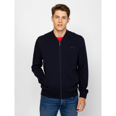 Férfi cipzáros, állógalléros pulóver, klasszikus szabással, egyenes zsebekkel, bordás passzés aljjal és kézelővel, kis márkajelzéssel az elején, a zseben és a hátán. Anyaga: 54% pamut, 38% poliészter, 8% viszkóz, piké. A modell 188 cm magas, és L-es méretet visel. T05023W2501