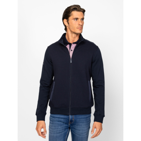 Férfi cipzáros, állógalléros pulóver, klasszikus megjelenéssel, többféle anyaggal, egyenes zsebekkel, kis szövött márkajelzéssel az ujján. Anyaga: eleje és háta: 50% polészter, 48% pamut, 2% elasztán, jacquard anyag, ujjak, gallér: 100% pamut, french terry, váll rész, zseb: 100% poliészter. A modell 188 cm magas és L-es méretet visel. T05027W2501